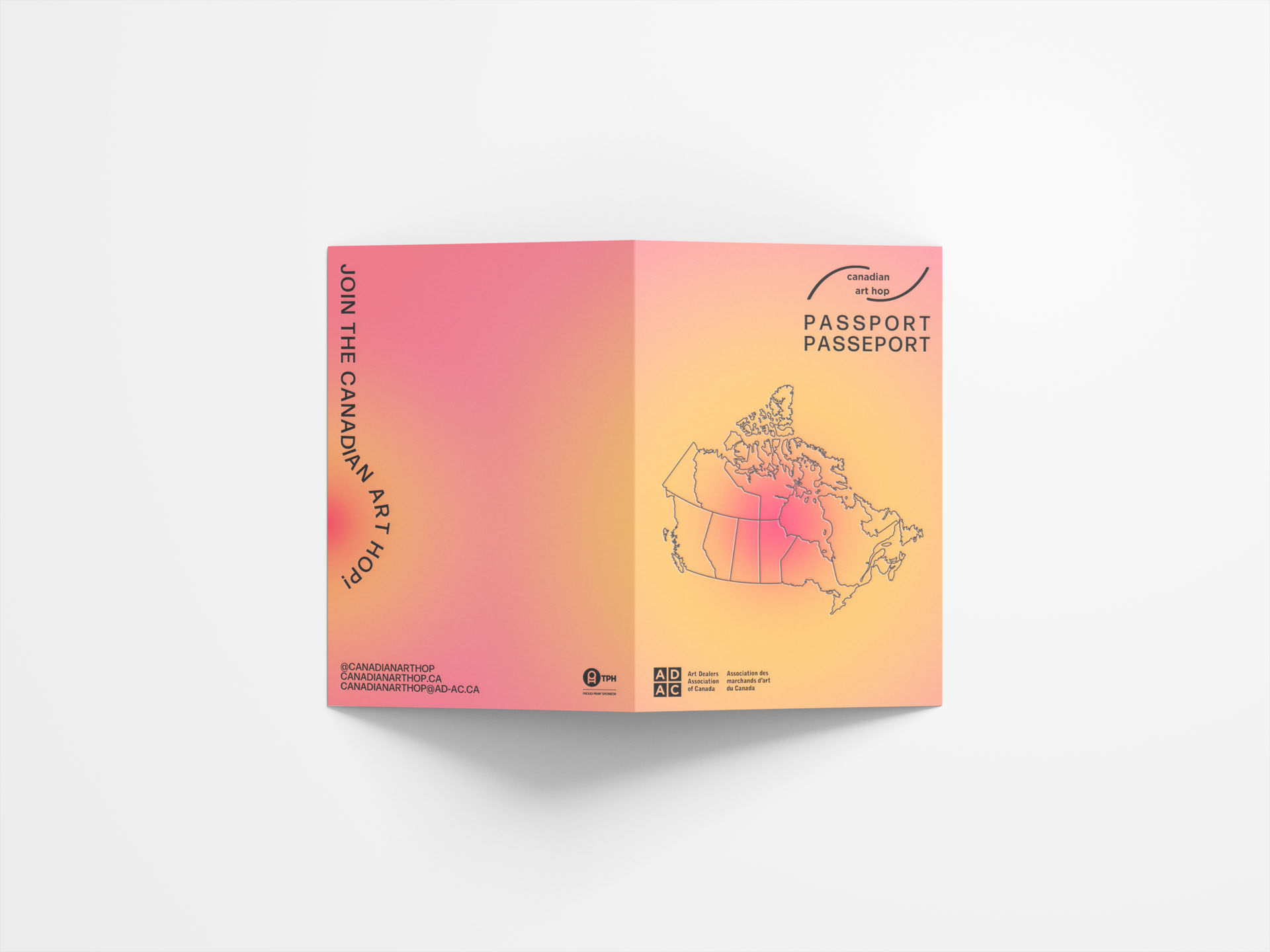 This is a passport for visitors to keep track of their gallery visits and participate in a giveaway. The passports include a QR code to the event’s webpage and a map of the galleries. The design references heat maps and the Canadian Passport, featuring playful colours and typography to offset the official-seeming influences.